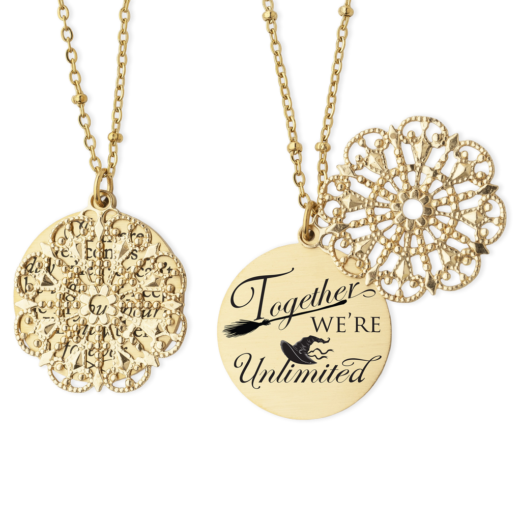 Celebrate the magic of unbreakable bonds with our “Together We’re Unlimited” engraved necklace—an inspiring line from Wicked the Musical that speaks to the power of friendship, unity, and believing in one another. This piece is a beautiful reminder that when you stand together, there’s no limit to what you can achieve.